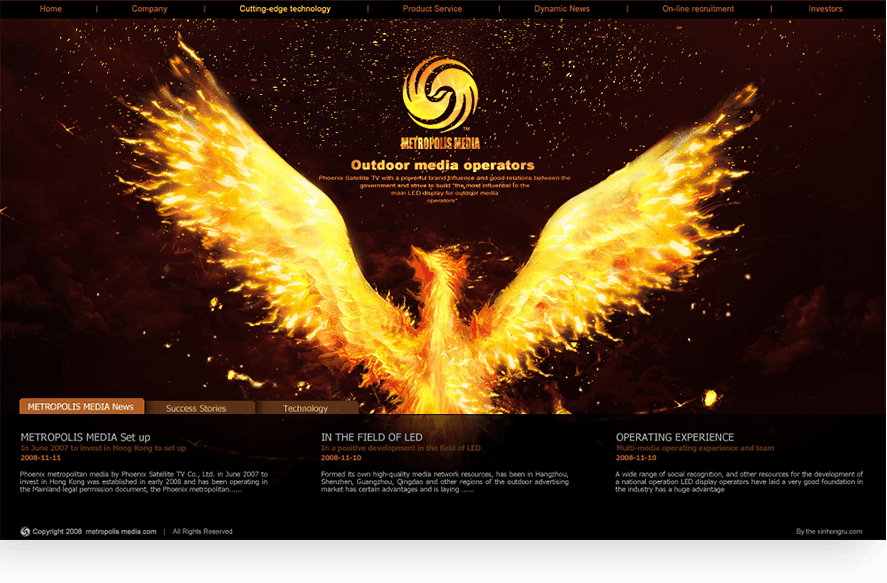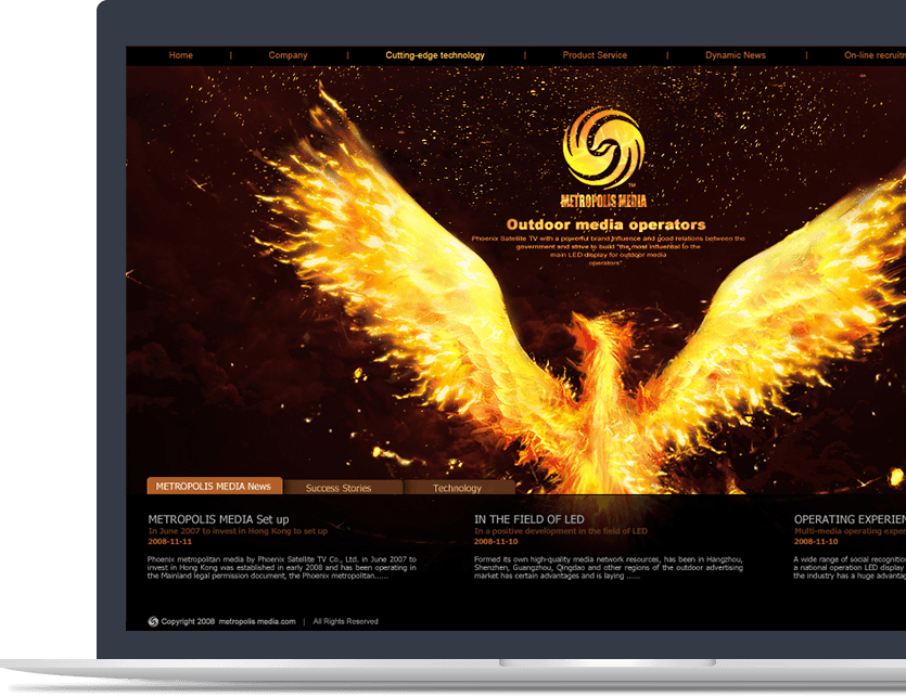 官網(wǎng)以鳳凰傳媒的標(biāo)志性圖標(biāo)和鳳凰圖案作為創(chuàng)意靈感,通過熾熱的火鳳凰表現(xiàn)鳳凰都市傳媒澎湃的新聞熱情和敢于承擔(dān)的社會責(zé)任。頁面視覺感官效果和鳳凰都市傳媒品牌調(diào)性高度吻合,成為鳳凰都市傳媒在互聯(lián)網(wǎng)領(lǐng)域閃亮的名片。