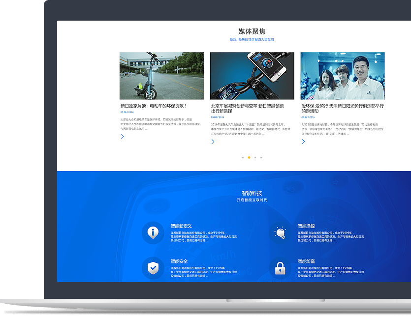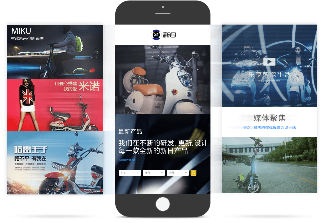 新日電動(dòng)車官網(wǎng)以品牌為核心,以產(chǎn)品為基礎(chǔ),通過JS/CSS3交互技術(shù)、全屏視頻等方式, 塑造企業(yè)創(chuàng)新、智能的品牌形象。