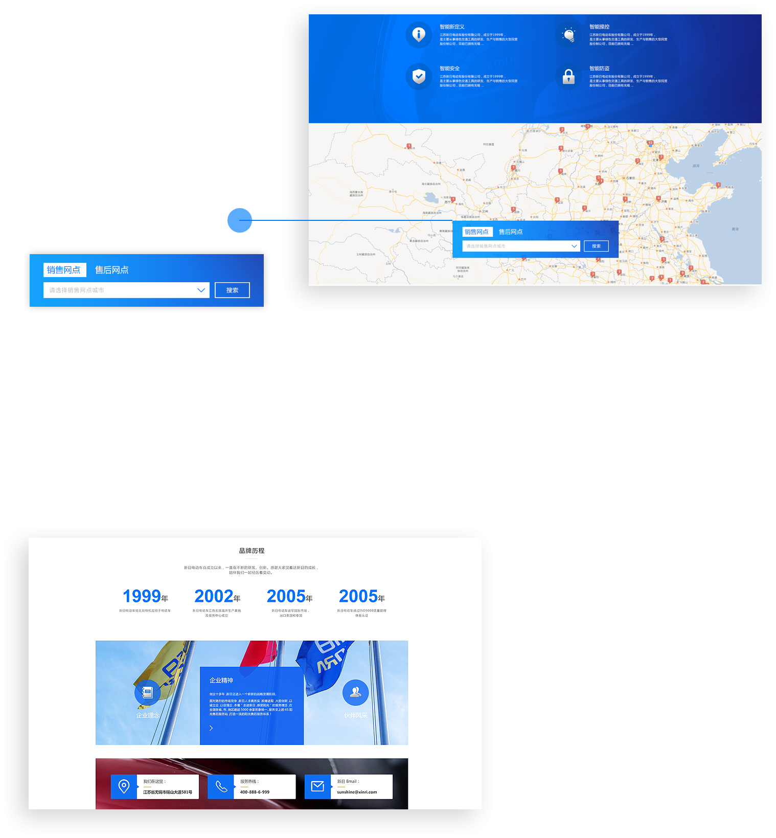 新日電動(dòng)車官網(wǎng)調(diào)取百度地圖實(shí)時(shí)數(shù)據(jù),通過標(biāo)簽定位的方式,實(shí)現(xiàn)銷售網(wǎng)點(diǎn)、售后網(wǎng)點(diǎn)的查詢,極大的方便了用戶,提升了服務(wù)質(zhì)量和銷售渠道。
