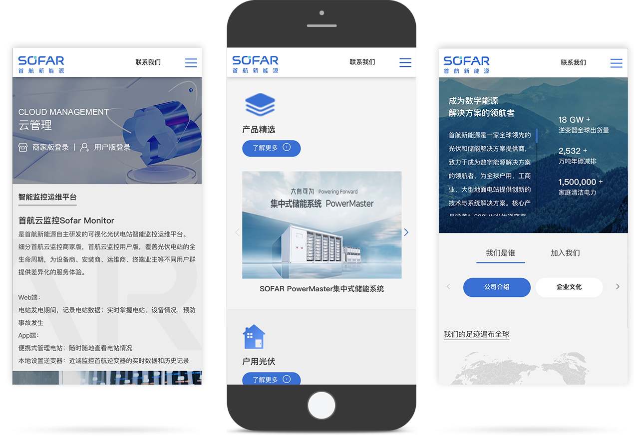 首航云監(jiān)控Sofar Monitor 是首航新能源自主研發(fā)的可視化光伏電站智能監(jiān)控運維平臺。 細分首航云監(jiān)控商家版,首航云監(jiān)控用戶版,覆蓋光伏電站的全生命周期,為設備商、安裝商、運維商、終端業(yè)主等不同用戶群提供差異化的服務體驗。