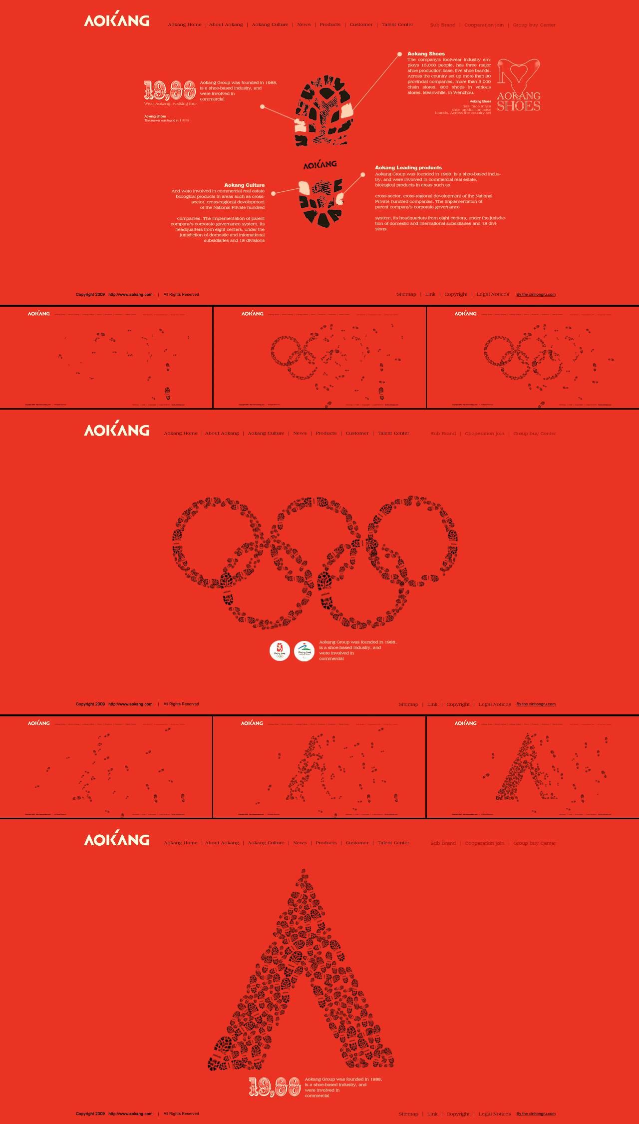 如圖所示,新鴻儒根據(jù)奧康集團所在行業(yè)優(yōu)勢,將企業(yè)發(fā)展核心配合鞋印動態(tài)展示,生動直觀;又結(jié)合奧康集團作為2008年奧運贊助商這一特征,以鞋印組成奧運五環(huán),放大其奧運精神;最終,鞋印組合為奧康集團標志性logo,升華企業(yè)文化。