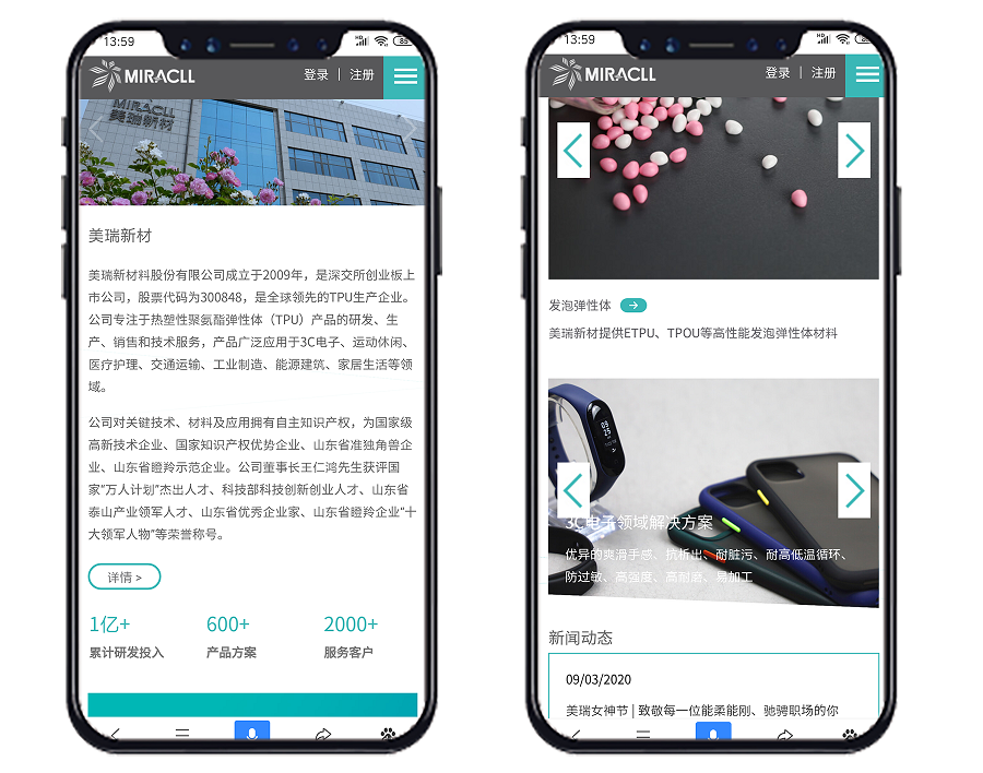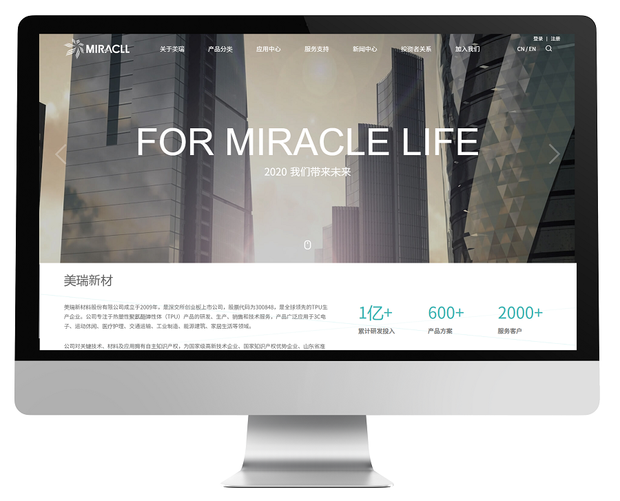 美瑞新材料對關鍵技術、材料及應用擁有自主知識產權,為國家級高新技術企業(yè)、國家知識產權優(yōu)勢企業(yè)、山東省準獨角獸企業(yè)、山東省瞪羚示范企業(yè)。公司始終堅持以客戶滿意和為客戶創(chuàng)造價值為導向,踐行專業(yè)、可靠、創(chuàng)新、合作、環(huán)保的經營理念,為客戶提供高效、低成本的差異化產品解決方案,在向客戶提供高性能TPU產品的同時,也為其提供個性化、專業(yè)化的技術服務,滿足其定制化需求。本次網站的全新搭建,使美瑞新材料在互聯網領域展現出全新的品牌形象。